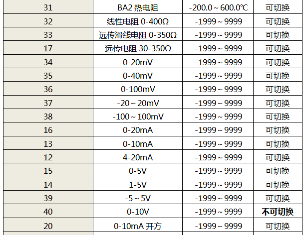 1、全切換是指用戶可根據需求任意設置輸入分度號表格中的信號類型