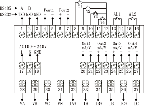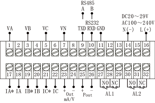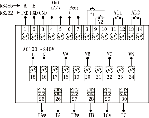 3、外形尺寸120×120mm多功能電力儀表接線圖