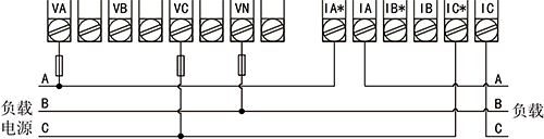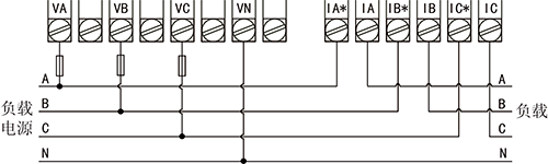 5、接線時(shí)確保輸入電流與電壓相序一致,否則會(huì)出現(xiàn)顯示數(shù)值與符號(hào)錯(cuò)誤,同時(shí)確保電流進(jìn)出線連接正確(打*號(hào)端子接進(jìn)線)