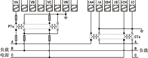 ◆三相四線系統(tǒng),多功能電力儀表接入3PT、3CT方式的接線圖