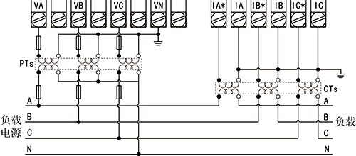 ②測量三相四線制高壓電氣系統(tǒng)參數(shù):電壓(Ua、Ub、Uc、N)經(jīng)3個(gè)PT后接入儀表;電流(Ia、Ib、Ic)經(jīng)3個(gè)CT接入儀表