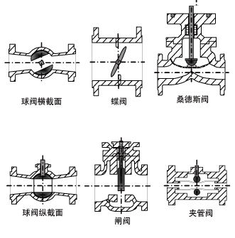 閥體種類多于驅動裝置種類,根據閥門類型、口徑大小和流體條件進行選擇。有角形閥、三通閥、隔膜閥、閘閥、蝶閥、球閥、偏心旋轉閥等。