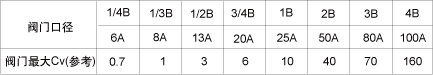 閥門差壓為1psi(0.07kg/cm2=7kPa),常溫水以每分鐘1加侖(3.785升)的速度流動時,將流量容量系數Cv的值定義為1。