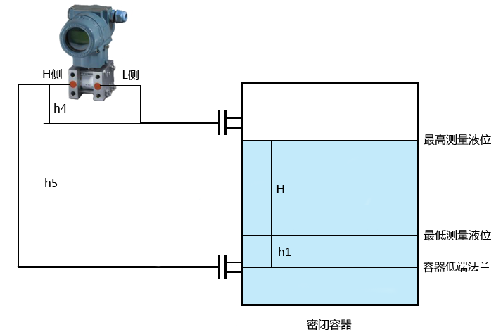 ④雙法蘭差壓變送器安裝在密閉容器低端法蘭水平線以上