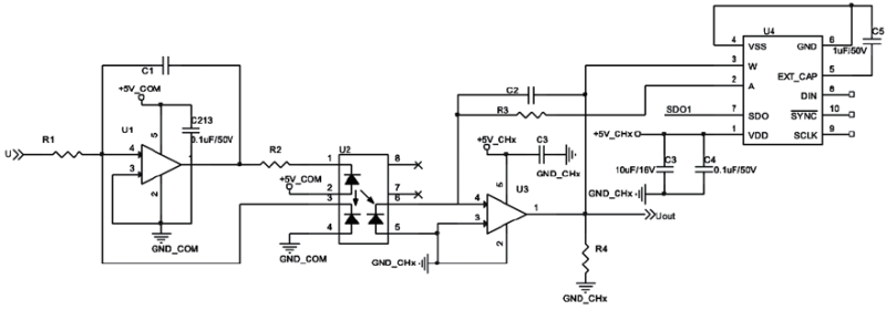 在U1和U3運(yùn)放的選型上,需要選擇噪聲密度小的,并且選擇噪聲對(duì)開關(guān)增益影響小的運(yùn)放。同時(shí),為了保證精度,對(duì)放大器的+5V供電電源需要控制紋波的幅度,為了降低對(duì)紋波的影響,需要對(duì)運(yùn)放的電壓抑制比進(jìn)行選擇。由于運(yùn)放的電源電壓的變化會(huì)影響輸入差分電壓的偏置點(diǎn),運(yùn)放內(nèi)部結(jié)構(gòu)的匹配性誤差,輸入差分電壓的偏置點(diǎn)的改變會(huì)引起輸入失調(diào)電壓的改變,同時(shí)導(dǎo)致輸出電壓的變化,影響電路的精度。在EDA設(shè)計(jì)的時(shí)候也需要對(duì)運(yùn)放的電源以及旁路電容的布置予以考慮,避免由PCB上引入更多的干擾影響模擬量信號(hào)隔離器轉(zhuǎn)換的精度。