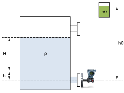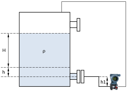 單法蘭差壓變送器的量程為L=H×ρ;零點遷移量為L0=h×ρ+h1×ρ1;在最低液位時,作用于變送器的靜壓為△P=h×ρ+h1×ρ1;在最高液位時,作用于變送器的靜壓為△P=H×ρ+h×ρ+h1×ρ1,公式中的h1為單法蘭差壓變送器正壓室中心線相對容器低端法蘭中心線高度;ρ1為單法蘭差壓變送器毛細管內介質密度。