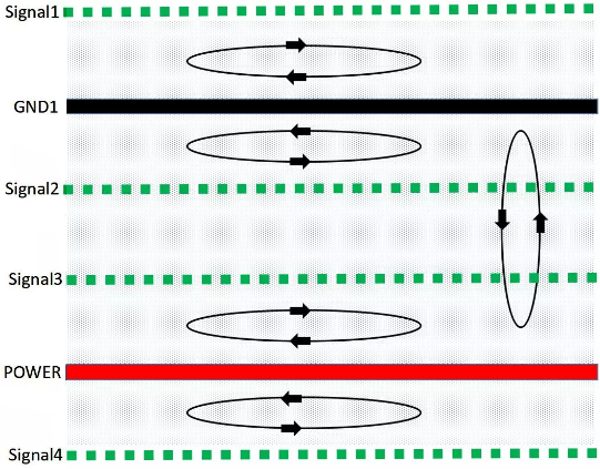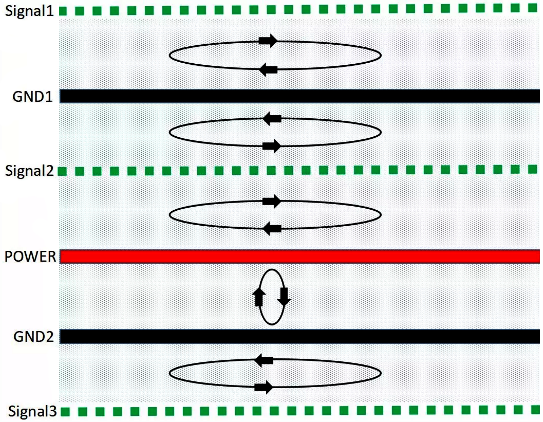 PCB疊層EMC規劃與設計思路的核心就是合理規劃信號回流路徑,盡可能減小信號從單板鏡像層的回流面積,使得磁通對消或最小化。