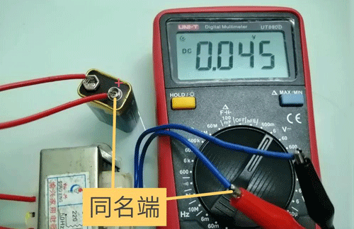 如上圖中,初級線圈接觸電池時,次級產生的感應電壓的正極是紅表筆所接的端口,所以電池正極所接的端口與萬用表紅表筆所接的端口是同名端。