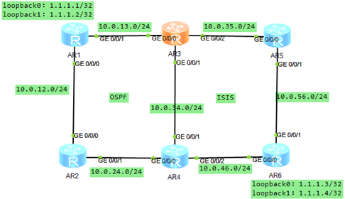 右邊網(wǎng)絡(luò)使用ospf協(xié)議,左邊使用isis協(xié)議,R3和R4連接的鏈路即運(yùn)行ospf,也運(yùn)行isis,實(shí)現(xiàn)在各自網(wǎng)絡(luò)中達(dá)到路由互通。