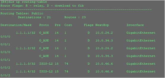可以看到AR4的路由表中已經(jīng)存在1.1.1.1/32和1.1.1.2/32的主機(jī)路由,說明引入成功。