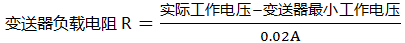 在設(shè)計系統(tǒng)時,必須要了解變送器的工作電壓范圍。當(dāng)變送器的最小工作電壓比較高,又需要帶較大的負(fù)載,當(dāng)24VDC供電變送器無法正常工作時,可以提高工作電壓來解決。總上所述,兩線制變送器的負(fù)載能力與變送器實際最小工作電壓有關(guān),其負(fù)載電阻計算公式如下: