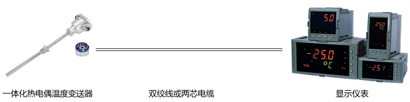 ①溫度變送器安裝在熱電偶接線盒內構成一體化熱電偶溫度變送器,熱電偶偶絲直接接到溫度變送器輸入端上,輸出為二線制4-20mA信號,變送器與顯示儀表或DCS系統直接用雙絞線或兩芯屏蔽電纜連接,不使用熱電偶補償導線。