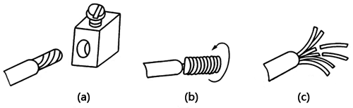 在接線柱上連接多股芯線時,先用鋼絲鉗將多股芯線進一步絞緊,以保證壓接螺釘頂壓時不致松散。此時應注意,針孔與線頭的大小應匹配,如圖2(a)所示。如果針孔過大,則可選一根直徑大小相宜的導線作為綁扎線,在已絞緊的線頭上緊緊地纏繞一層,使線頭大小與針孔匹配后再進行壓接,如圖2(b)所示。如果線頭過大,插不進針孔,則可將線頭散開,適量剪去中間幾股,如圖2(c)所示,然后將線頭絞緊就可進行壓接。通常7股芯線可剪去1-2股,19股芯線可剪去1-7股。