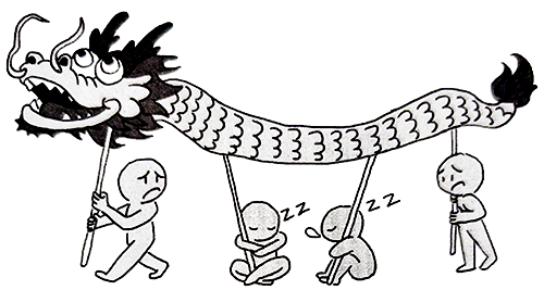 圖1 本來龍尾巴這一頭的控制指令可以通過一個人、一個人往下傳,控制整個舞龍動作的,但中間有兩個人開小差,這龍就舞不起來了,換句話說,不可控了