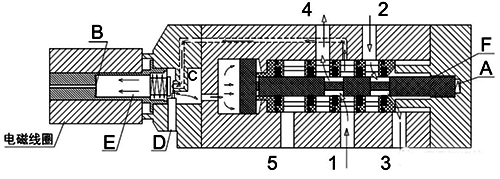 在電磁閥失電狀況下,進氣口1與出氣口2相通,出氣口4與排氣孔5相通,活塞F在閥內彈簧A的彈力下保持在左邊的位置,進氣口1處的氣源通過下圖紅色箭頭孔(該進氣孔為獨立孔,只與進氣口1連接,不與出氣口4連接)連接腔室內的C進氣口;