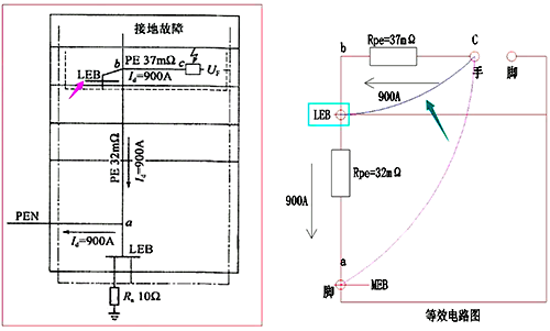 可知c和LEB之間只有一個(gè)PE支線電阻37mΩ,根據(jù)歐姆定律c-LEB之間電位差為900×37/1000=33.3V<50V安全電壓。