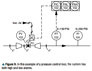 圖9中的壓力控制器PIC102旁邊有兩個符號-一個標為PAH,另一個標為PAL。這說明壓力控制器有一個高壓報警(PAH)和一個低壓報警(PAL)。在P&IDs上對報警的描述可能因CPI的不同部分而不同;在一些部門,報警的細節在工廠的功能規范文件中列出,而不是在P&IDs上顯示