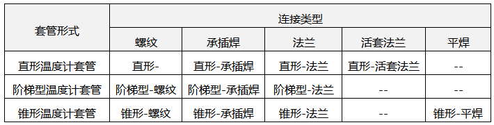 流程工業中常采用帶有保護套管的熱電偶、熱電阻和雙金屬溫度計等測量介質溫度。測溫點的工況決定溫度傳感器套管的類型、材質和連接形式。套管有直形、錐形和階梯形。一般中低壓的場合,可選用直形套管;對于被測介質流速較高、要求套管高強度的場合,可選用錐形套管;對于要求阻力小、響應時間短的場合,可選用階梯形套管。溫度計套管連接有法蘭、螺紋和焊接三種形式。溫度計套管材質通常選用316SS不銹鋼或其他材料。