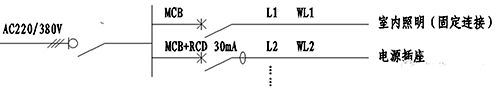 圖中MCB為微型斷路器;MCB+RCD為剩余電流斷路器,可為分體組合式,也可一體式產品。