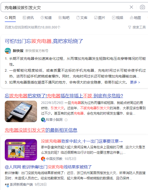 其次存在火災(zāi)風(fēng)險(xiǎn)。這種案例已經(jīng)發(fā)生多起,尤其網(wǎng)上購(gòu)買(mǎi)的劣質(zhì)充電器,火災(zāi)風(fēng)險(xiǎn)更大。不能掉以輕心。據(jù)光明網(wǎng)報(bào)道,今年9月,杭州某小區(qū)居民因充電器沒(méi)拔引發(fā)火災(zāi),所幸沒(méi)有造成人員傷亡。