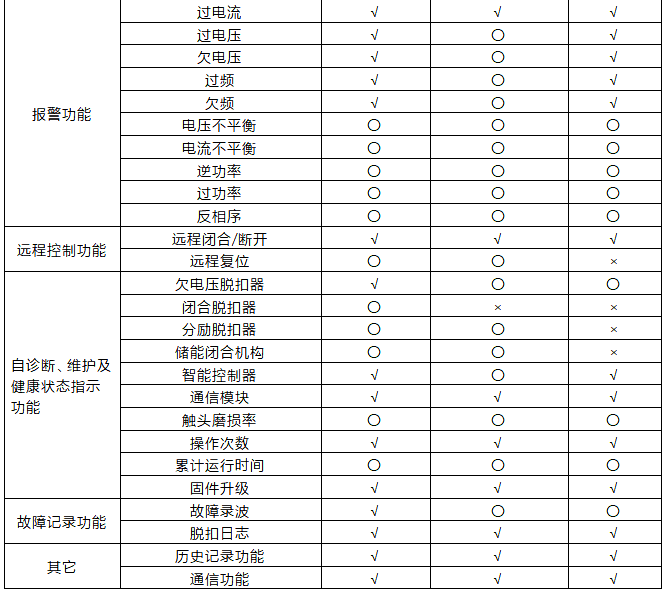 下面電力儀表從狀態感知、電氣測量、報警功能、遠程控制、自診斷、維護及健康狀態指示、故障記錄、歷史記錄、通訊等方面對比介紹萬能式斷路器、塑殼斷路器和智能斷路器的功能差別。