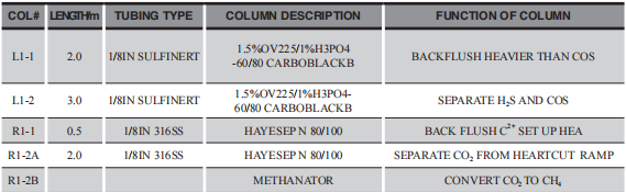 從表1和表2的配置圖中可以看出分離H2S和COS的色譜柱都經(jīng)過鈍化處理(硅鋼管),分離CO2的色譜柱選的是316不銹鋼管,里面根據(jù)需要分離的組份放入不同的填充物(填料)。分離總硫的色譜柱中填充 1.5%OV225(高惰性交聯(lián))和1.0%的磷酸,所以新鄉(xiāng)公司與新疆公司分離總硫的毛細(xì)管色譜柱長度一樣。分離CO2的色譜柱新鄉(xiāng)和新疆公司都是采用的安捷倫色譜柱,新鄉(xiāng)使用的固定相填充物為HAYESEP N型的新疆為HAYESEPQ型,所以長度不一樣,從長度來看新鄉(xiāng)項目的分離效果較好。