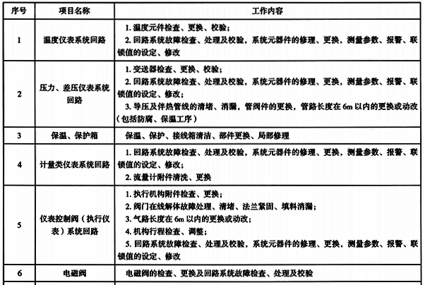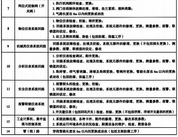 故障處理指自動化控制與儀表各種故障原因查找和處理工作(如設備、管路密封點出現跑、冒、滴、漏等故障)。故障處理工作范圍與原定額對比,取消了溫度儀表法蘭消漏、節流裝置消漏、機械量儀表探頭更換三類故障,單列開關閥法蘭消漏、氣缸更換故障項目。故障處理的工作內容見表1。