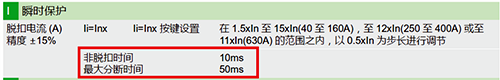 A點:故障電流達到了瞬時保護整定值10In,此時斷路器按瞬時保護脫扣時間動作,不脫扣時間為10ms,最大脫扣時間為50ms,即動作時間在10~50ms之間。
