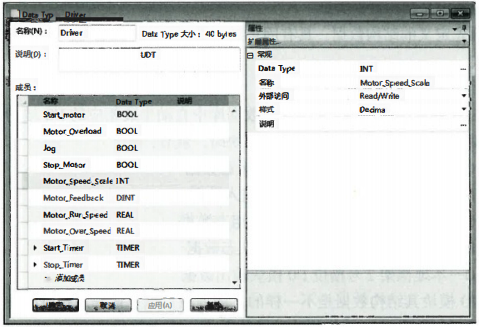 用戶自定義數(shù)據(jù)結(jié)構(gòu)。用戶自定義數(shù)據(jù)結(jié)構(gòu)(UDF)是在編程時(shí)為了某一控制任務(wù)組織相關(guān)數(shù)據(jù)而建立的數(shù)據(jù)結(jié)構(gòu),以便于數(shù)據(jù)的查找、監(jiān)視和傳輸?shù)取T诮?shù)據(jù)結(jié)構(gòu)的過程中,數(shù)據(jù)元素的定義順序與存儲(chǔ)器空間的占用有關(guān)。BOOL類型占1位,每建立一個(gè)BOOL元素,都會(huì)存放在剩余的空間上。如果空間不夠,再劃出新的32位字的空間。同理,SINT類型占8位,每建立一個(gè)SINT元素,都會(huì)存放在剩余的空間上。如果空間不夠,再劃出新的32位字的空間。其他類型以此類推。一個(gè)完整的用戶自定義數(shù)據(jù)結(jié)構(gòu)UDF的大小一定是32位的整數(shù)倍。