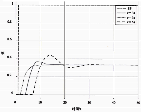 圖2是不同時間常數基準自衡對象Kc=0.25時設定值階躍響應??梢园l現:隨著被控對象時間常數的增加,設定值階躍響應越來越緩慢。所以最優比例增益應該和被控對象的時間常數成正比。被控對象時間常數越大最優比例增益應該越大,反過來被控對象時間常數越小最優比例增益應該越小。