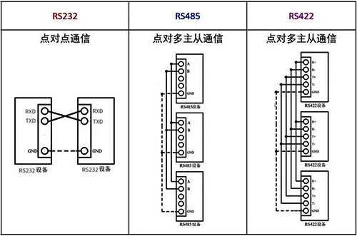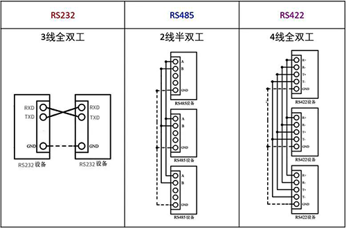 典型工作方式,RS232:3線全雙工;RS485:2線半雙工;RS422:4線全雙工。