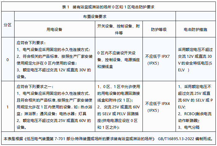 上述要求是強制性的,必須滿足!其他要求可參見《低壓電氣裝置第7-701部分:特殊裝置或場所的要求裝有浴盆或淋浴的場所》 GB/T 16895.13-2022,該標準對0、1區(qū)的要求總結起來如表1所示。