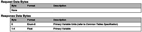 Read Primary Variable,讀主變量,將以IEEE 754浮點類型返回主變量的值(5字節,字節0:主變量單位代碼,字節1-4:主變量)。
