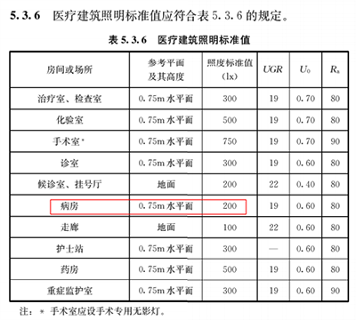 5.3.6 醫療建筑照明標準值中,病房的參考平面及其高度規定為0.75m水平面,在舊標準中為地面,其照度標準值也進行了調整,改為200lx。