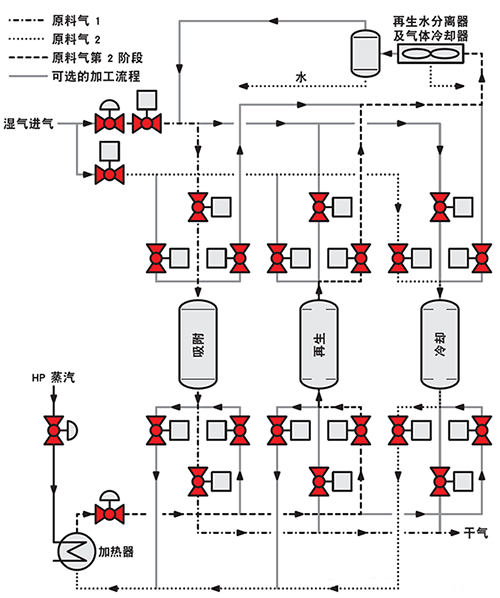 使用分子篩脫水(MSD)除去天然氣中的水分。 多個裝滿干燥劑的圓柱按序排列,進氣可通過吸附、再生和冷卻容器進行循環。這些閥門能夠應對高溫和低溫、夾帶微粒、溫度激增和高循環頻率,并且在很多年內能夠進行可靠截止。
