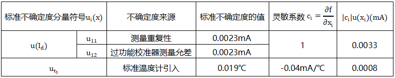 (1)由溫度變送器的輸出電流的測(cè)量重復(fù)性和多功能校準(zhǔn)儀的測(cè)量誤差引起的不確定度分量u(Id)