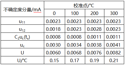 (8)對(duì)測(cè)量范圍-50~350℃的帶傳感器的溫度變送器在各校準(zhǔn)點(diǎn)的測(cè)量不確定度的評(píng)定見(jiàn)表2。