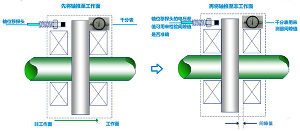 3、保持軸頂在非工作面上,假設3500軸位移通道設置零位電壓為-10V,(使用3300XL 8mm系列電渦流傳感器進行測量)則軸位移傳感器安裝電壓應該是用零位電壓減去剛剛推軸測量出的間隙值所對應的電壓的一半。其計算公式為:傳感器安裝電壓V=-[10-(D/2)×7.87],其中7.87V/mm為8mm電渦流傳感器靈敏度。這樣當軸回到中心點后,軸位移傳感器電壓即應該為-10V。其他不同的零點位置設計可據此類推,改變計算方法即可。