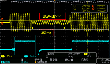 我們選擇的是一款寬電壓電子線圈接觸器,其線圈電壓范圍為100V~250VAC/DC,首先通電AC220V(幅值315V)讓接觸器吸合,通電時間200ms,此時接觸器已經吸合穩定,見圖7,黃線代表線圈電壓,藍線代表主觸頭信號。