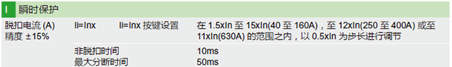 兩條斜曲線代表熱保護的最大動作時間(上)和最小動作時間(下),Ii=8In代表磁脫扣動作電流值,最右邊綠色區(qū)域代表能量脫扣,動作閾值25In,動作時間小于10ms。