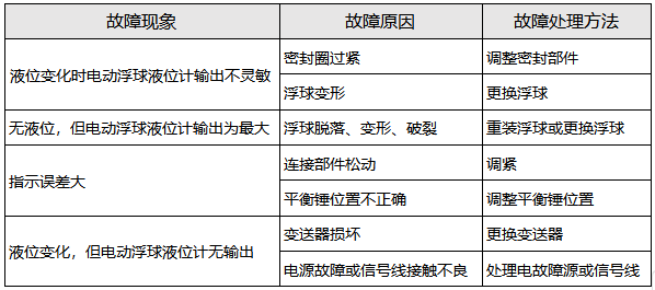 故障檢查、分析:原因有浮球脫落、浮球連桿斷裂、浮球轉(zhuǎn)換機(jī)構(gòu)損壞、浮球指針或表頭損壞幾種情況。經(jīng)現(xiàn)場檢查按壓儀表浮球轉(zhuǎn)換機(jī)構(gòu)、浮球連桿轉(zhuǎn)動靈活;測量指針和表頭檢查均無故障,與工藝聯(lián)系分析為內(nèi)部浮球脫落。