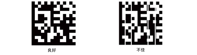 使用標簽打印機時:標簽打印機中的熱敏打印機常用于二維碼的打印。我們可以看到右側的DataMatrix碼(不佳)中有白色豎線顯示。這種現象叫做點缺失,通常是由于打印頭上有灰塵或打印頭老化導致。