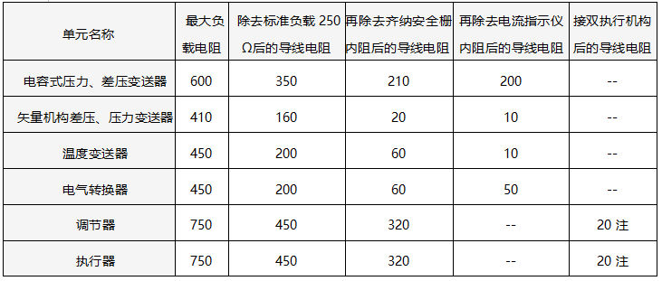 20世紀80年代,上海自動化儀表一廠針對其生產的DDZ-Ⅲ型電動單元組合儀表的變送器、調節器、電氣轉換器、操作器等單元,在最低供電電壓(22.8V)時允許的導線電阻,曾列過一個表格供用戶參考,表后還注明:“如果系統設計時導線電阻不超過上表,則信號電流在4-20mA范圍內,都能保證傳送的精度不變。”由于其還有現實意義,特把此表格提供如下: